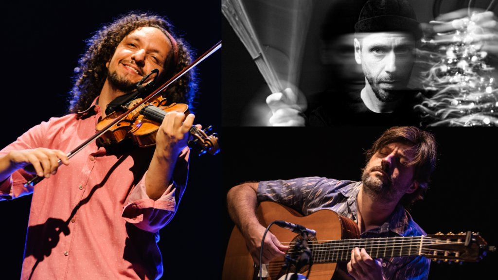 Novomundo – In diesem einzigartigen Konzertprogramm treffen drei Weltenbummler, drei virtuose Musiker, die durch ihre intensive Beschäftigung mit anderen Kulturen eine eigene musikalische Sprache gefunden haben, aufeinander. Der Gitarrist Michi Ruzitschka hat 20 Jahre in Brasiliens Schmelztiegel Sao Paulo gelebt, um die traditionelle Gitarrenmusik auf höchstem Level zu studieren. Der Percussionist Bernhard Schimpelsberger wiederum verbrachte viele Jahre in Indien, um die komplexen Rhythmen der Indisch-klassischen Musik zu erlernen und auf die westliche Percussion zu übertragen. Beide Musiker wollten sich nie in anderen Kultur verlieren, sondern deren bereichernde Einflüsse mit ihren